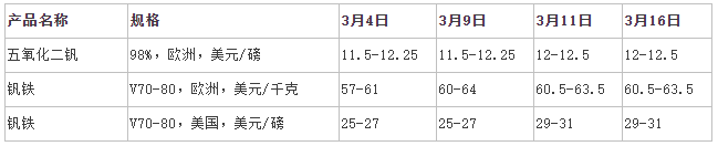 《全球鐵合金網(wǎng)》2022-3-17:歐洲市場(chǎng)最新釩鐵價(jià)格高位持穩(wěn)運(yùn)行,昨日(3月16日)歐洲釩鐵(V70-80)價(jià)格暫穩(wěn)在60.5(平)-63.5(平)美元/千克釩,折人民幣50計(jì)價(jià)約19.30-20.26萬元/噸;歐洲98%五氧化二釩價(jià)格在12-12.5美元/磅,折人民幣約16.54-17.23萬元/噸;美國(guó)釩鐵(V70-80)價(jià)格在29-31美元/磅釩,折人民幣50計(jì)價(jià)約20.39-21.80萬元/噸(備注:以上折人民幣價(jià)格不包含關(guān)稅、增值稅、港口費(fèi)用)。