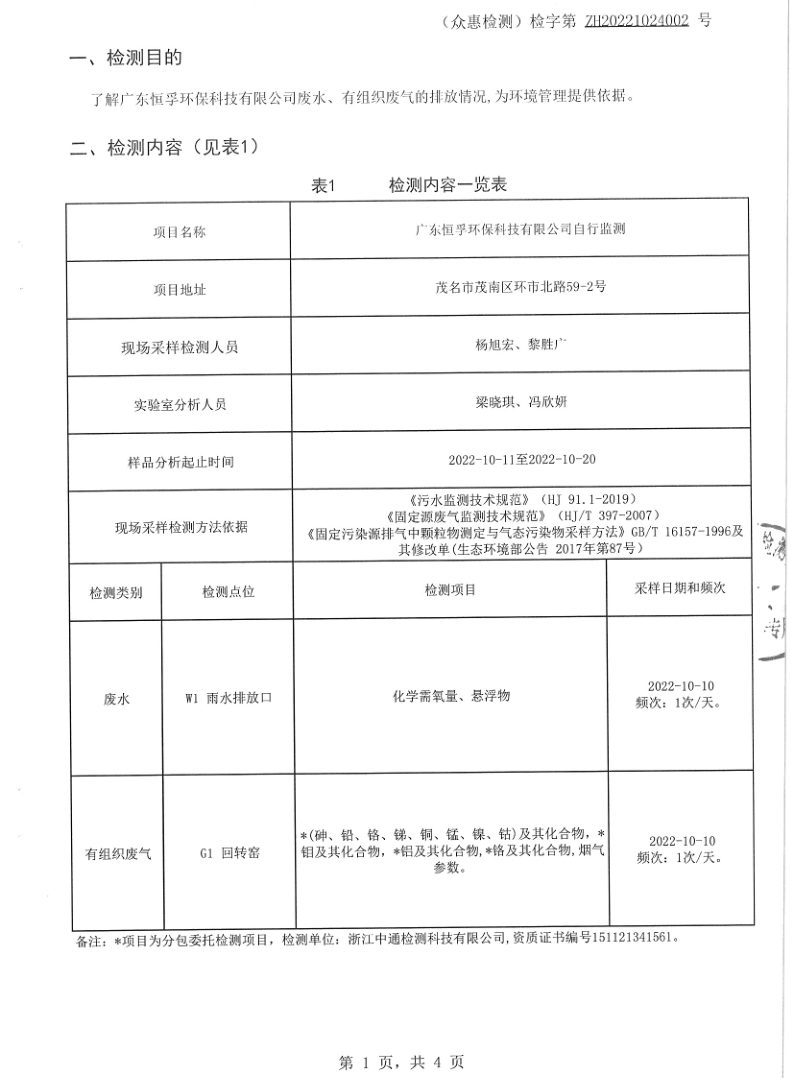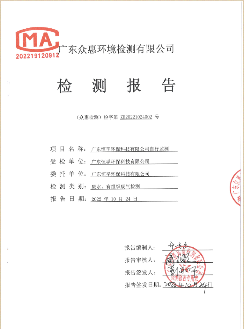 2022年10月廣東恒孚環(huán)保科技有限公司雨水、廢氣自行監(jiān)測(cè)報(bào)告